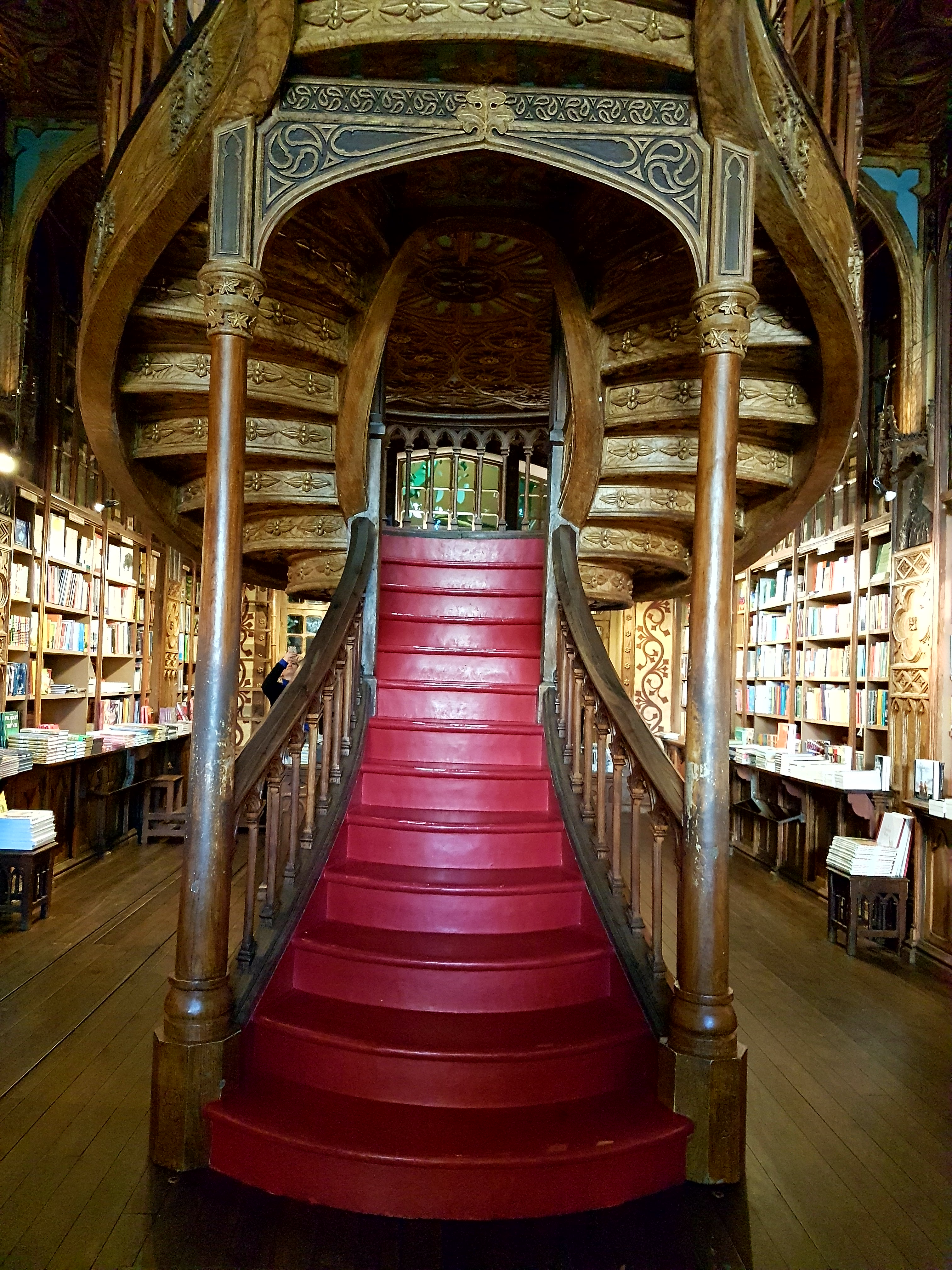 Nous prenons ensuite la direction de la Librairie Lello ou Librairie Chardron (Adresse : Rua das Carmelitas, 144 à Porto). Au-dessus de cette rue, il y a également une place avec une charmante petite fontaine.Vous pouvez réserver votre visite de la librairie à l’avance (lien ici) ou bien sur place dans le magasin se trouvant juste à côté…